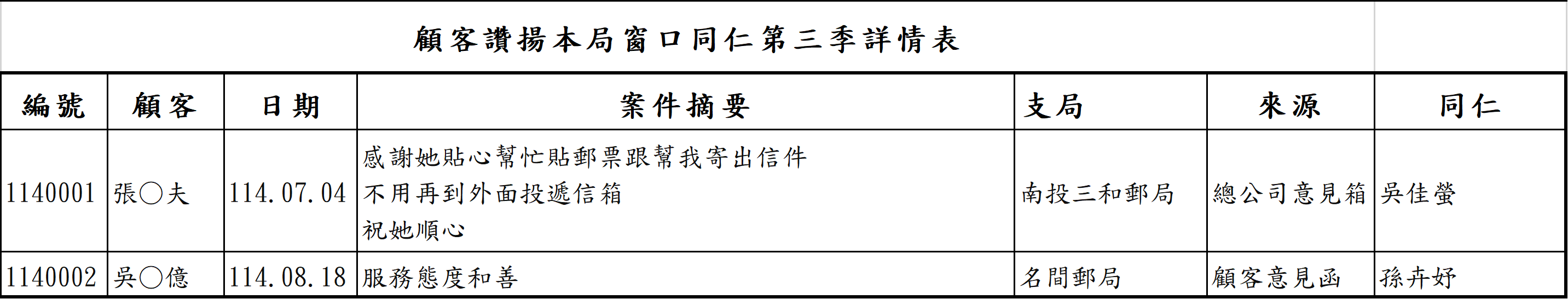 顧客讚揚本局窗口同仁114年度第3季 115/03/11