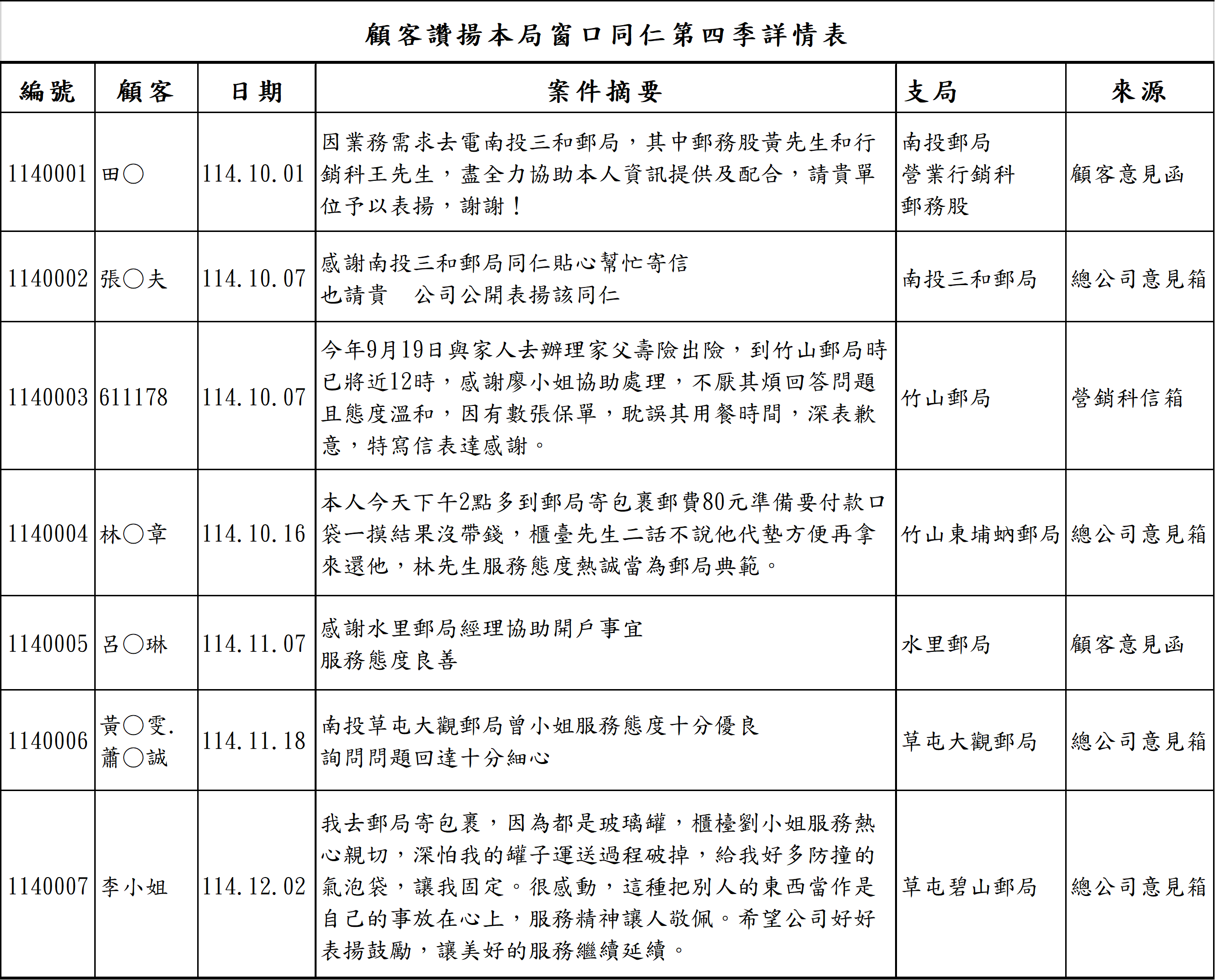 顧客讚揚本局窗口同仁114年度第4季 115/03/11