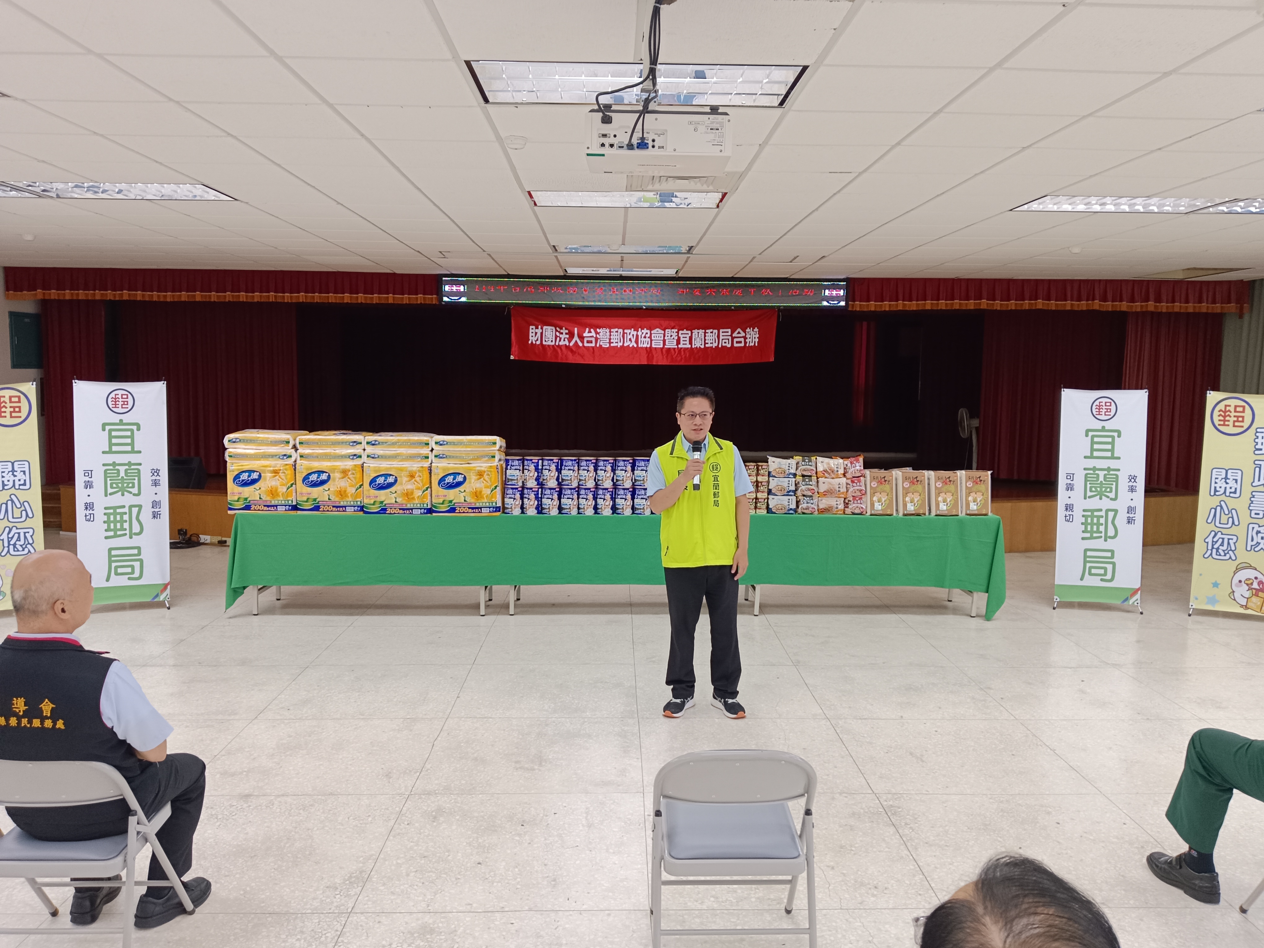 宜蘭郵局陳雍宗局長表示,台灣郵政協會暨宜蘭郵局秉持著「服務地方,在地郵政」的服務理念及精神,積極參與社會公益,長期透過捐贈民生物資及實際關懷行動,與獨居長輩同享佳節氣氛,以善盡郵政社會責任,充分發揮「老吾老以及人之老」之精神。