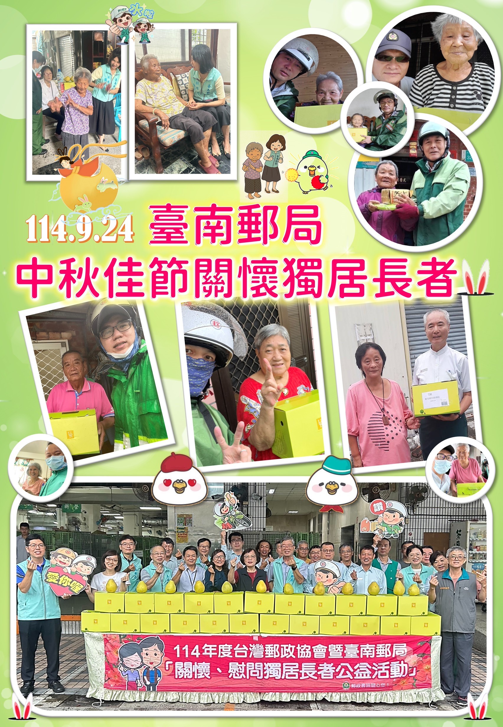 因應今年農曆閏月的特殊情況,為了讓象徵祝福的文旦能以最佳狀態送至長者手中,臺南郵局與台灣郵政協會攜手合作,於9月24日舉辦了「郵情中秋月,團圓不孤單」關懷活動。當日郵務士將文旦禮盒逐一送至獨居長者的住處,將節日的祝福與人情的溫度一併送進他們心中。