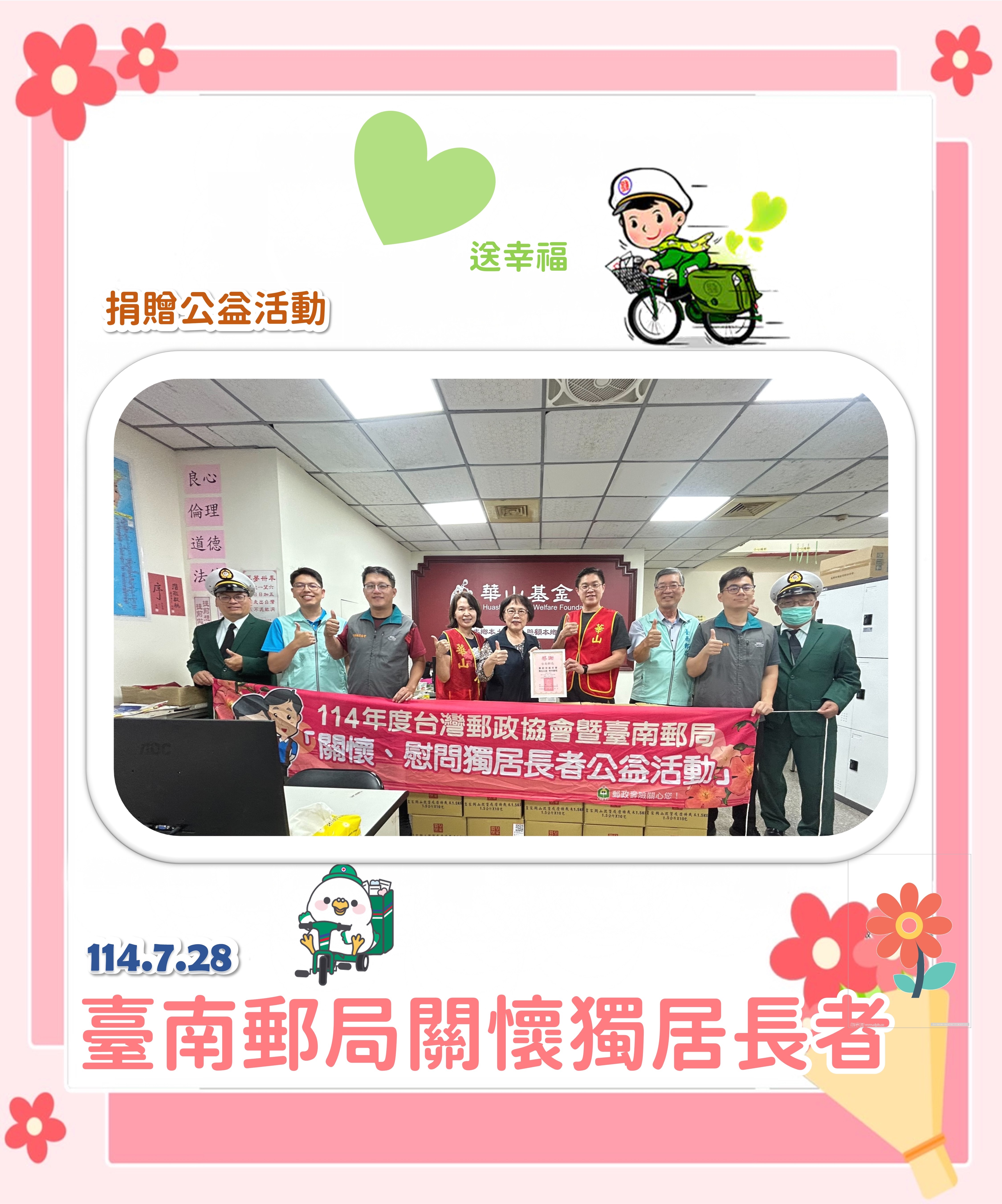 臺南郵局長期關懷在地弱勢群體,114年7月28日下午於華山基金會台南A愛心天使縣辦舉辦捐贈活動,捐出真空包裝米200包,傳遞社會溫情,關懷獨居長者的日常需求。