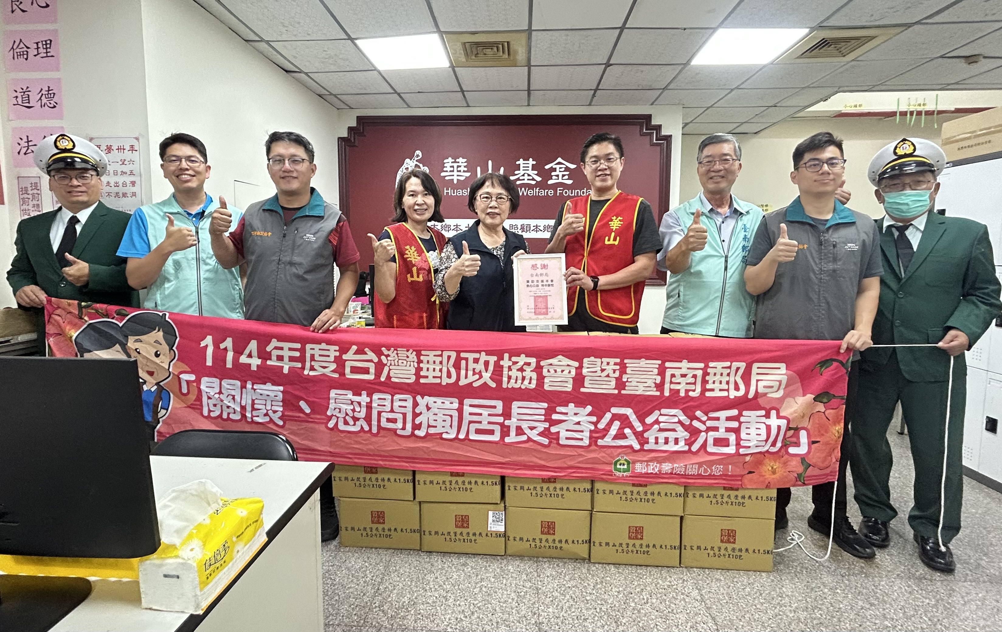 為了持續關懷在地弱勢群體,臺南郵局於114年10月22日上午,與華山基金會台南A愛心天使縣辦共同舉辦了愛心捐贈活動,這次捐贈的物資包括衛生紙、奶粉、營養品以及魚罐頭等生活必需品,藉此幫助獨居長者滿足日常需求,傳遞社會溫暖。