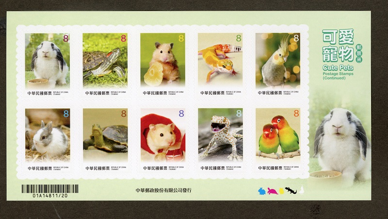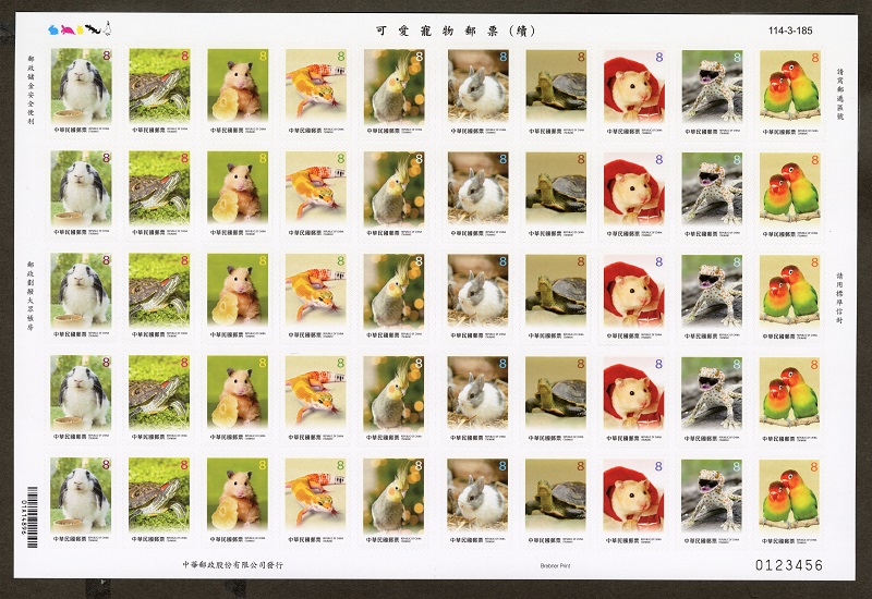 Continuing the series of Cute Pets Postage Stamps released in 2025, Chunghwa Post has issued a set of ten stamps, each with a denomination of NT$8. The stamps feature adorable pets, including rabbits, turtles, hamsters, geckos and parrots. To add to philatelists’ fun and to the convenience of the general stamp-using public, these stamps have been released in two self-adhesive formats—one souvenir sheet and a sheetlet of 50 stamps. The stamp designs showcase popular small pets loved by the public, including gentle and adorable rabbits, auspicious and long-lived turtles, agile and playful hamsters, uniquely charming geckos and brightly colored parrots. These adorable pets, with their various charming appearances, not only provide warm companionship to families but also bring much laughter and heartfelt moments.To purchase postage stamps, please go directly to the post office branches, Postal Museum or order on line at https://stamp.post.gov.tw.